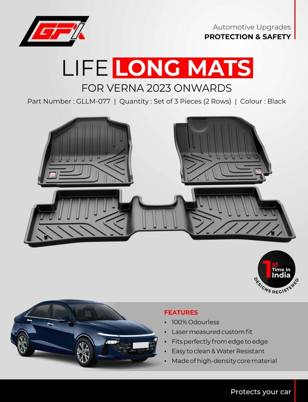 All-Weather Life Long Mats for Hyundai Verna 2023+ | Premium 3D Floor Mats – Set of 3 (2 Rows) is a premium interior mats designed for Hyundai Verna 2023+. It delivers a factory‑fitted look, reliable durability in Indian conditions, and hassle‑free DIY installation.
