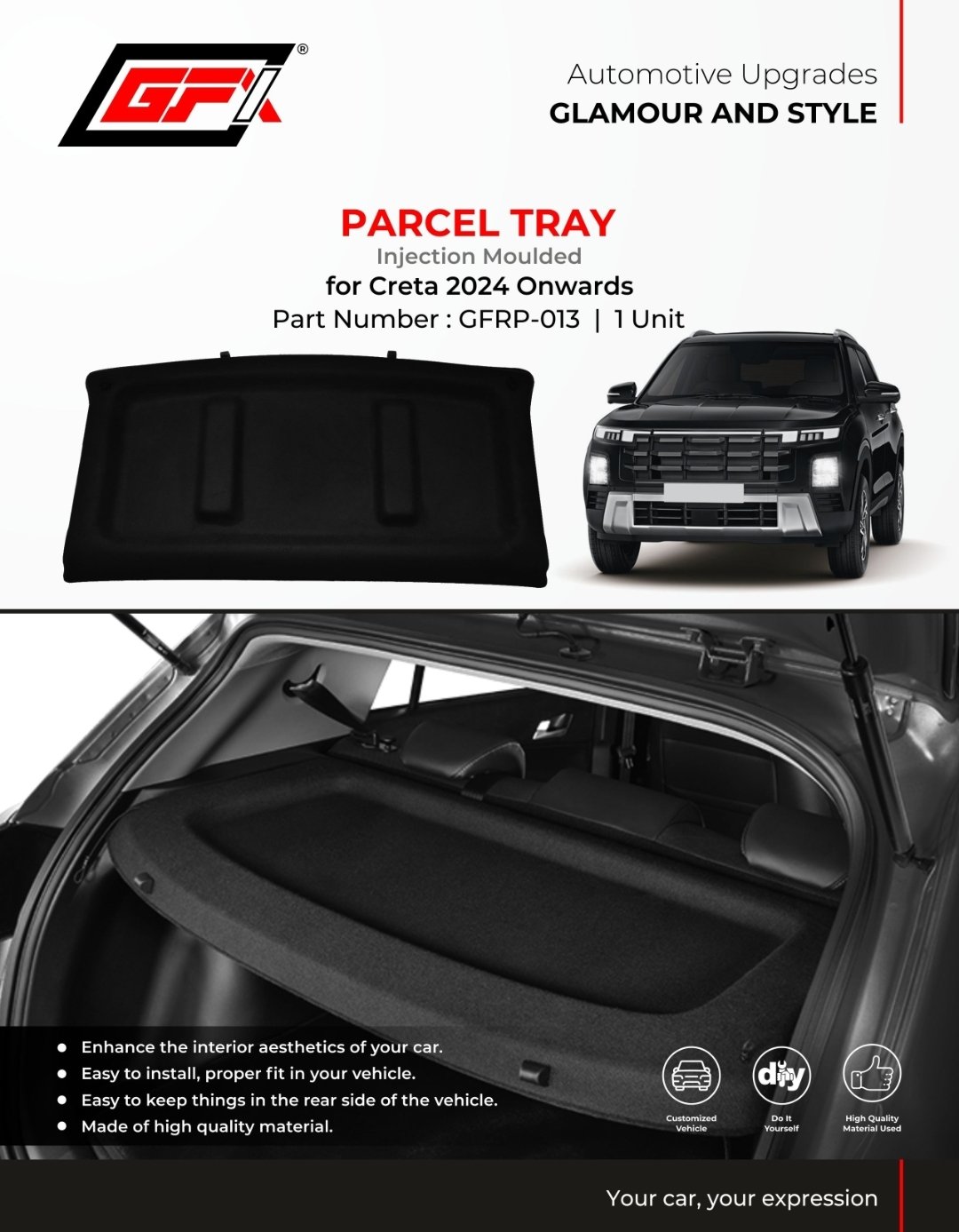 Organize your boot space better with the **GFX Parcel Tray** for Creta 2024+. Made with high-quality injection moulded material, this tray ensures durability, long life, and a perfect fit. Easy to install & helps keep luggage neat and secure.