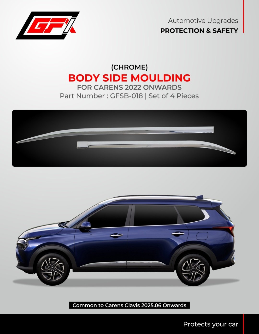 Protect your Kia Carens (2022 Onwards) with this 4-pc Chrome Body Side Moulding set (GFSB-018). Provides stylish protection, enhances side profile, and fits Clavis models.