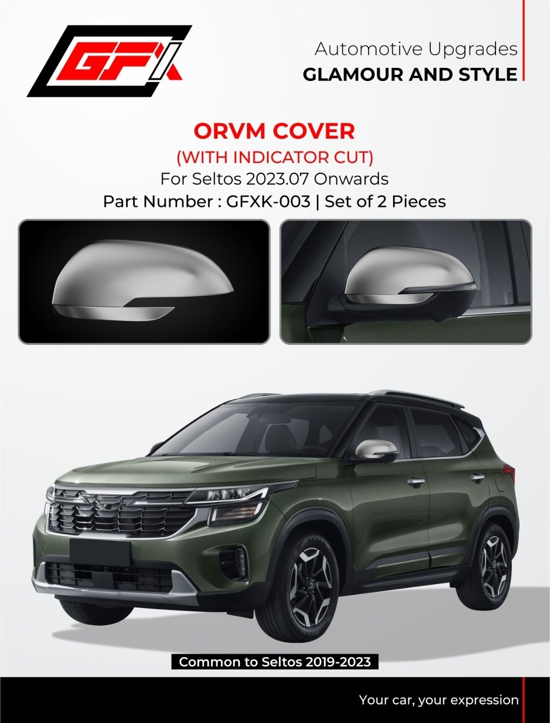 Give your KIA Seltos (2023.07 Onwards Facelift) a dazzling, customized look with the Premium Chrome Finish ORVM Covers with Indicator Cut (Product Code: GFXK-003). These eye-catching covers are designed to fit perfectly over your existing Outside Rear View Mirrors, instantly transforming the side profile of your SUV.