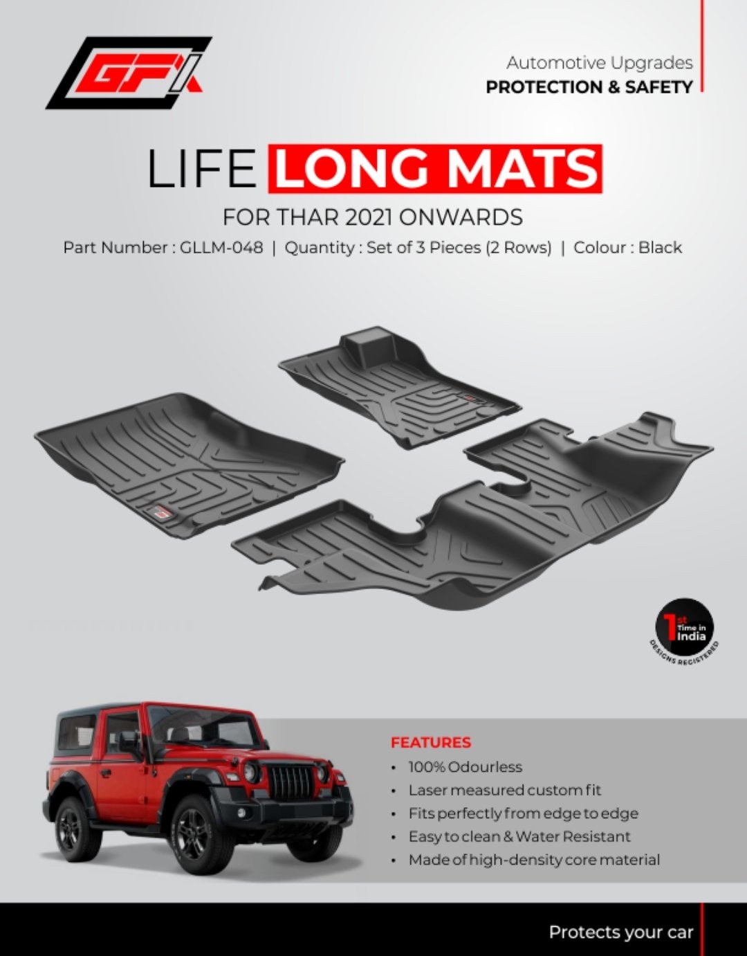 GFX Life Long All-Weather Floor Mats for Mahindra Thar (2021-Onwards) | 100% Odourless & Waterproof | Custom Fit 3-Piece Set