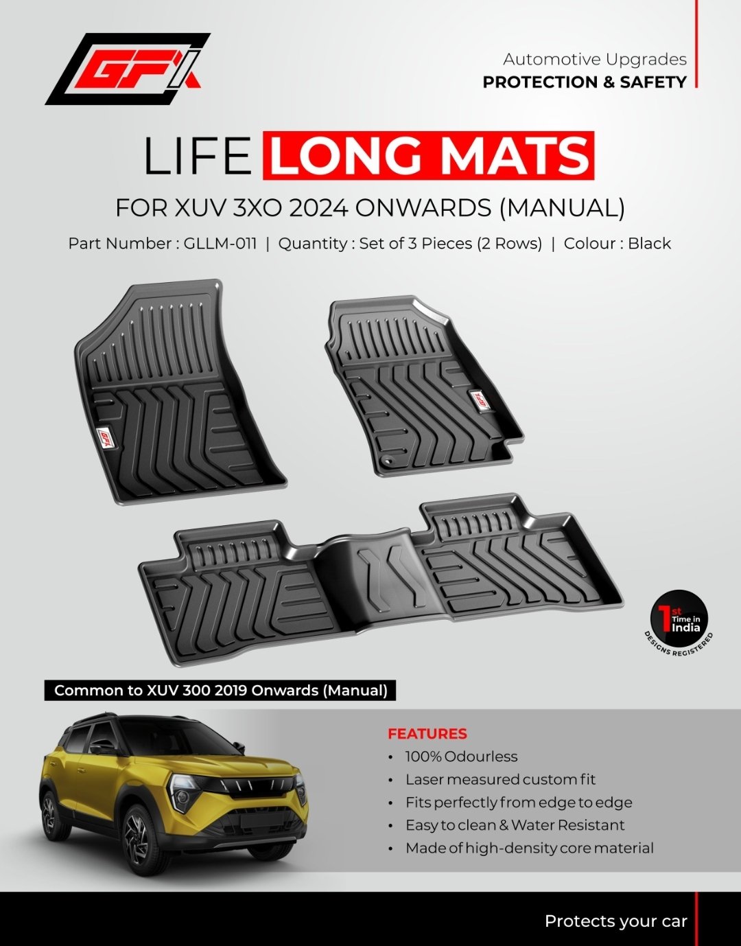 Upgrade your Mahindra XUV 3XO or XUV 300 with GFX Life Long Floor Mats. Experience 100% odourless, laser-measured, edge-to-edge protection. Water-resistant and easy to clean!