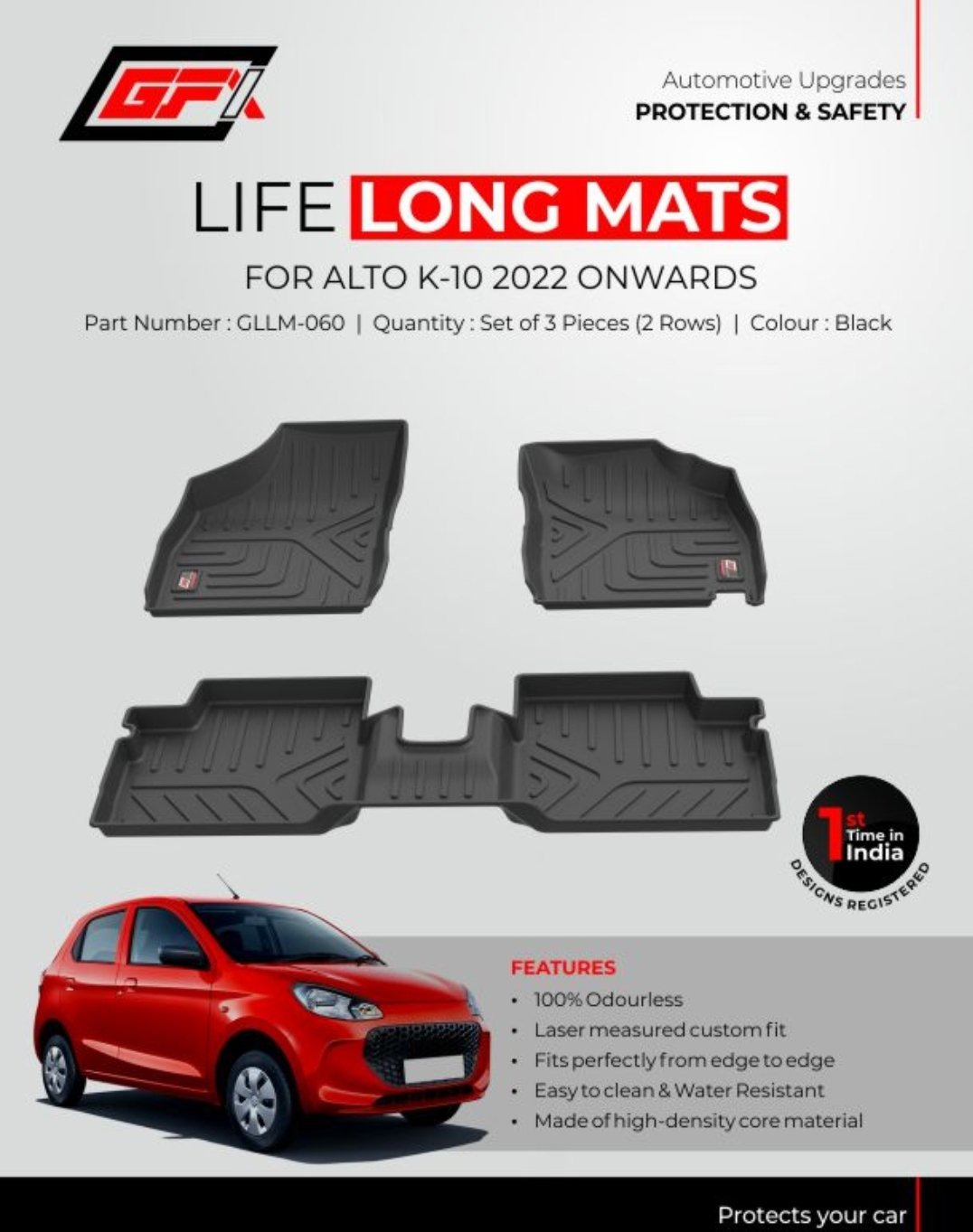 Protect your Maruti Alto K10 (2022+) with premium GFX Life Long Mats. 100% odourless, laser-measured custom fit, and water-resistant. Shop at Crezy Car Tech!
