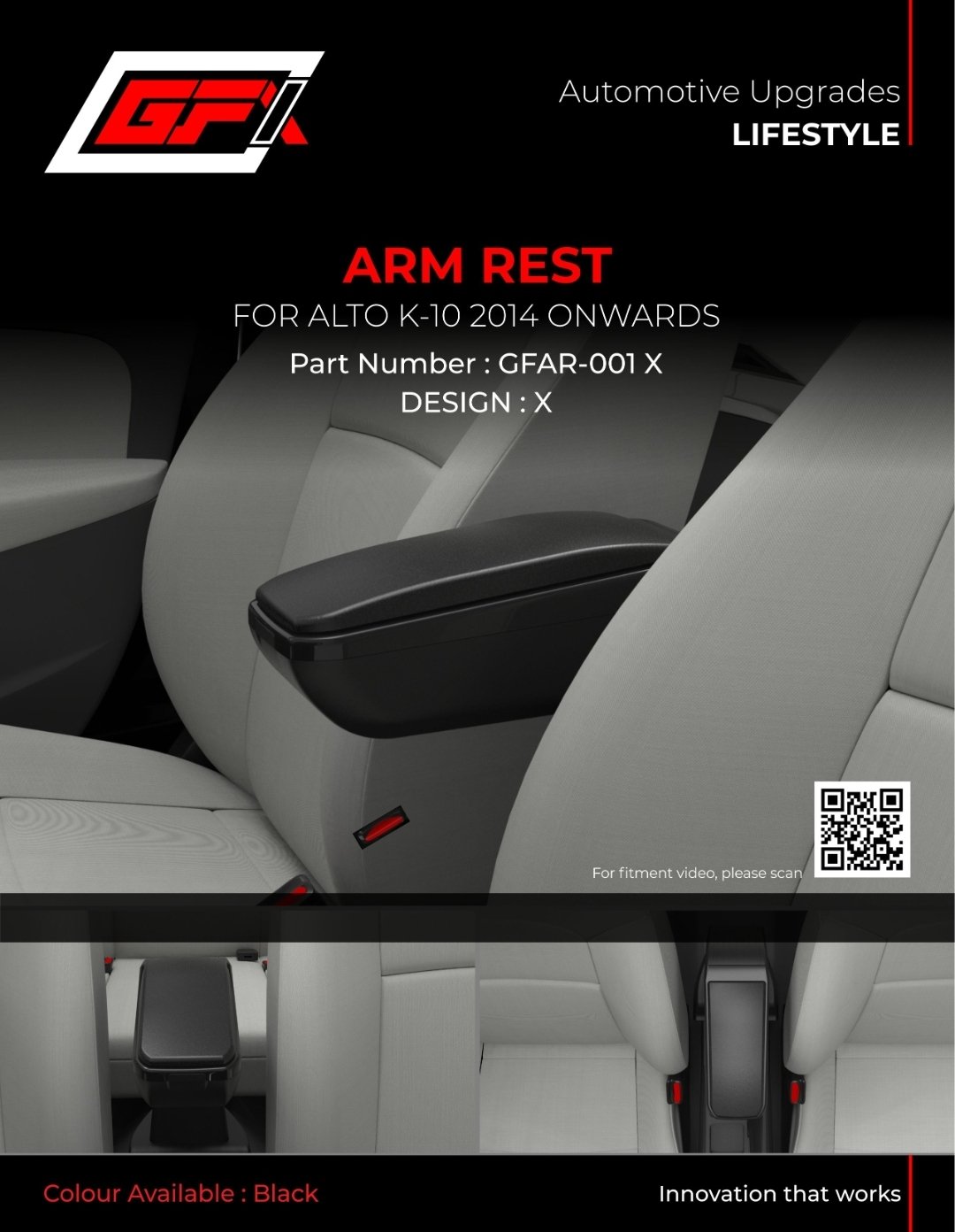 The GFX Premium Black Armrest (Design: X) is exclusively engineered to seamlessly integrate into the center console of your Alto K10. Unlike universal armrests that wobble or require heavy modifications, this dedicated armrest offers a snug, factory-fitted look. It provides the perfect ergonomic support for your resting arm, significantly reducing driving fatigue and improving your overall posture behind the wheel.