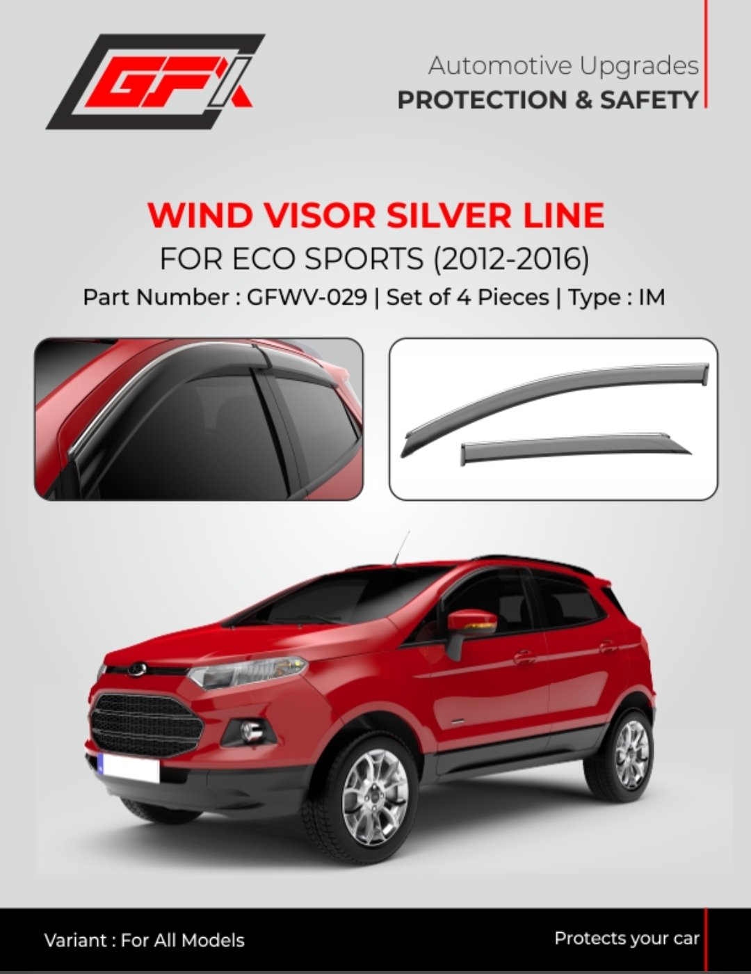 Enhance your driving experience with GFX Wind Visor Silver Line for Ford EcoSport 2012-2016. This set of 4 visors offers rain and wind protection while giving a sleek silver line look. Perfect fit and easy installation ensure durability and function.