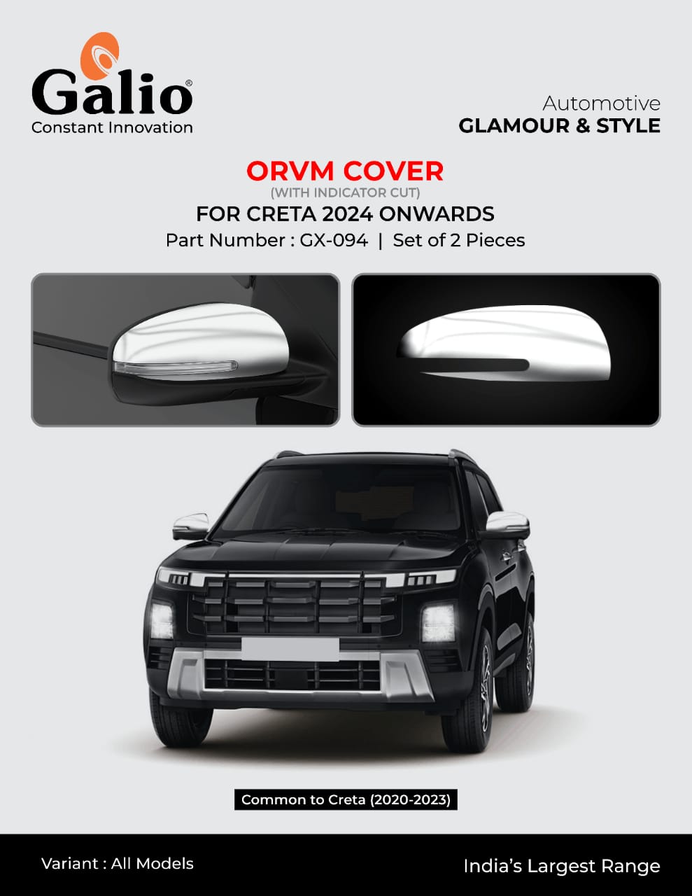 Enhance the look of your Hyundai Creta (2024 onwards) with this premium ORVM Cover with Indicator Cut. Designed for a perfect fit, these covers add a touch of elegance with their high-quality chrome finish. They protect your side mirrors from scratches and minor impacts while complementing the carās aesthetics. Also compatible with Creta models from 2020 to 2023.