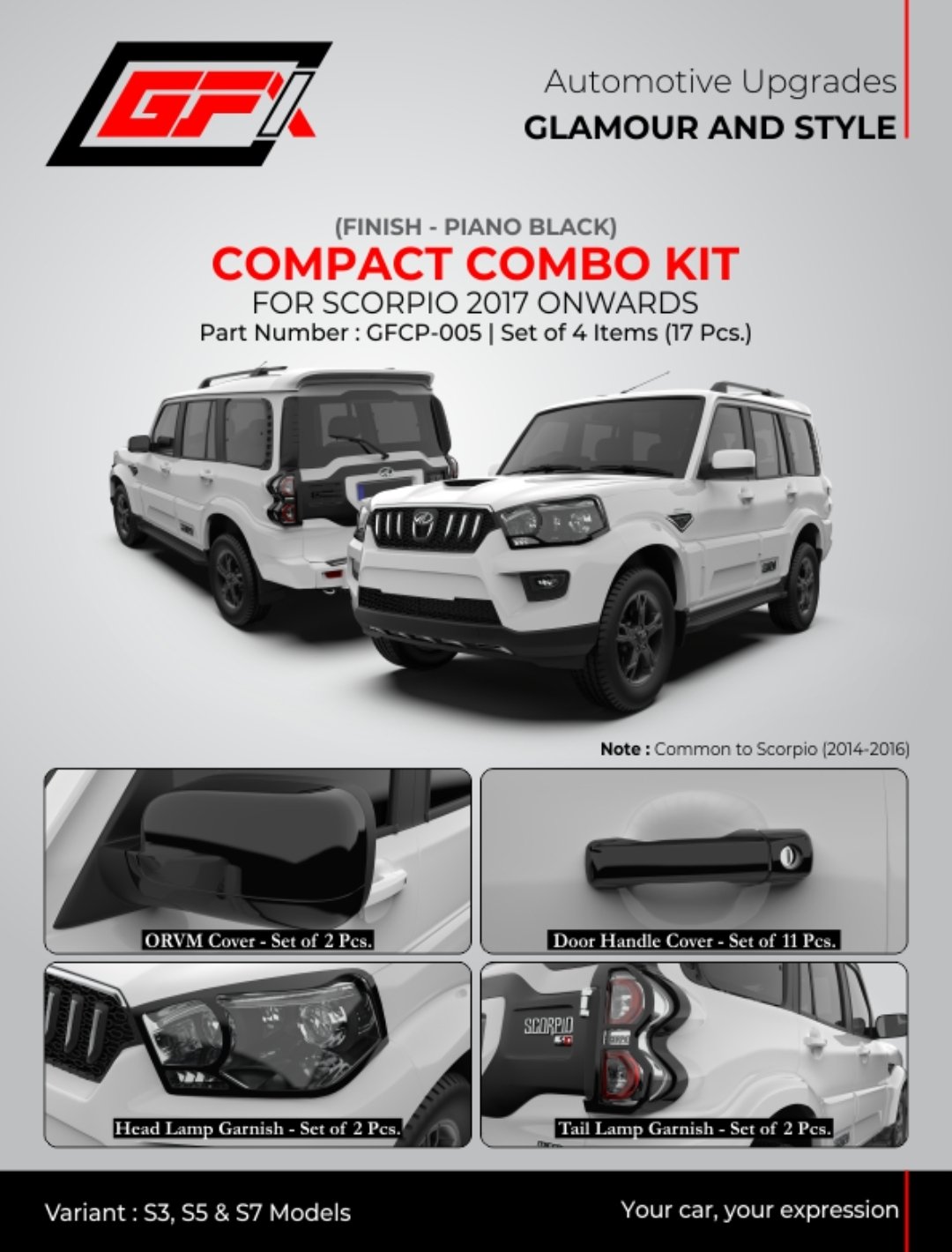 Give your SUV a powerful sporty makeover with the Compact Piano Black Combo Kit for Mahindra Scorpio (2017 onwards – S3, S5, S7 variants) — a premium exterior styling package designed for car owners who love bold design with long-term protection.