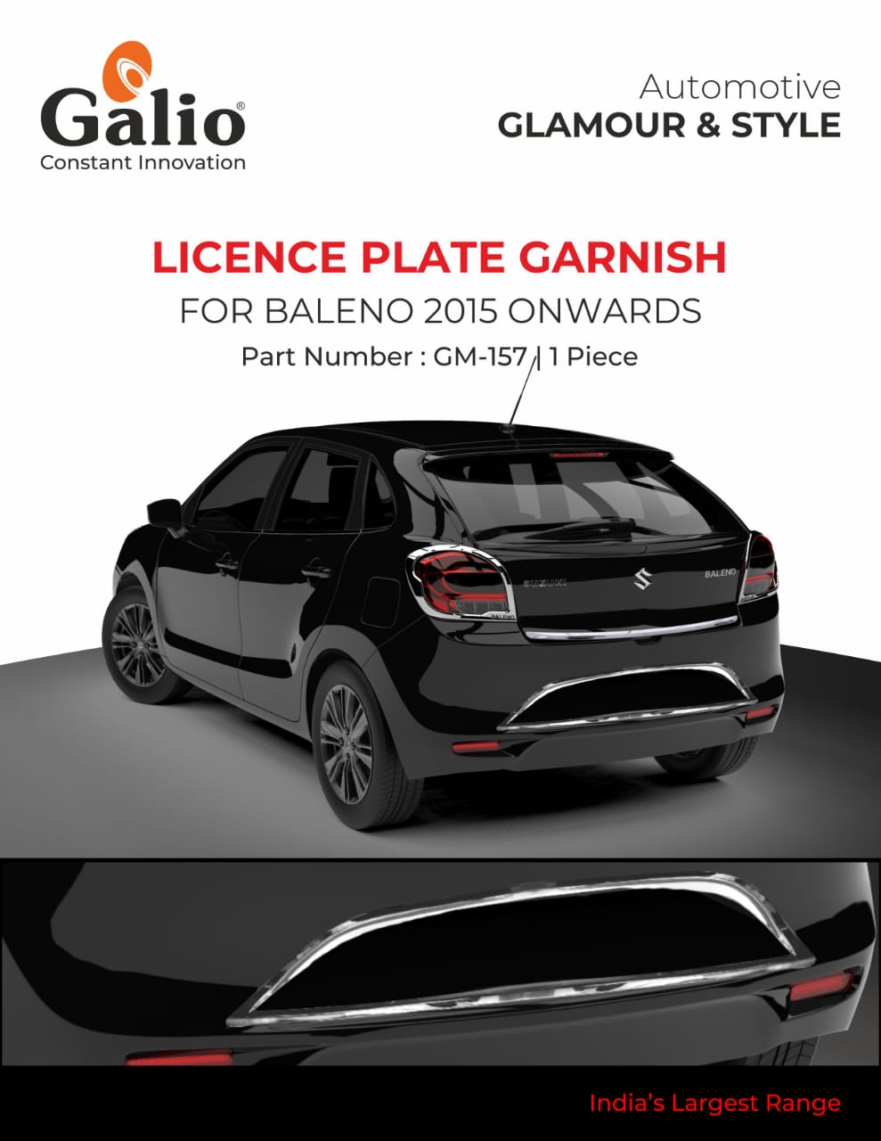 Enhance the rear look of your Maruti Suzuki Baleno (2015 onwards) with this premium Licence Plate Chrome Garnish. This sleek accessory adds a stylish and shiny chrome frame around your licence plate area, giving your vehicle a more unique and upscale appearance. Made from durable ABS material with a fully chrome-plated finish, it resists scratches and is easy to maintain. Installation is simple and secure with pre-applied 3M adhesive tape.