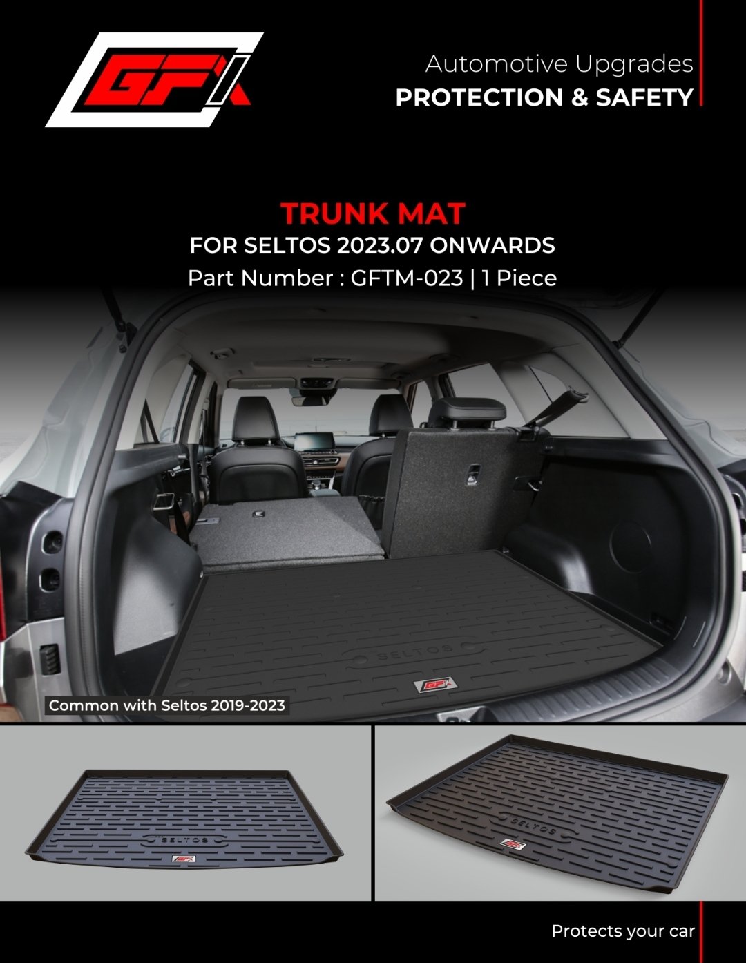 Get the custom-fit Premium Rubber Trunk Mat for your KIA Seltos 2023 Facelift and 2019-2023 models. All-weather protection, anti-slip design, and easy to clean. Product Code: GTFM-023.