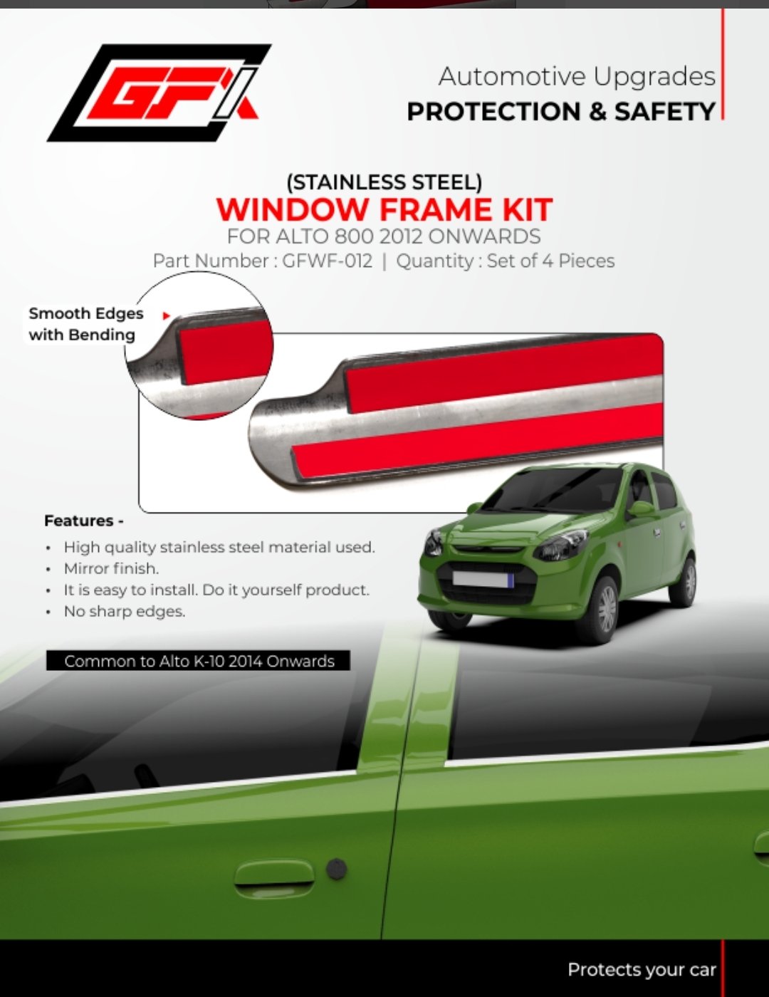 Are you looking to give your Maruti Suzuki Alto 800 a sophisticated, high-end facelift without breaking the bank? The GFI Automotive Upgrades Stainless Steel Window Frame Kit is the perfect exterior styling accessory for your vehicle. Designed specifically for all Maruti Suzuki Alto 800 models from 2012 to 2019, this custom-fit window garnish seamlessly outlines your car’s windows, providing a sleek, factory-upgraded look.