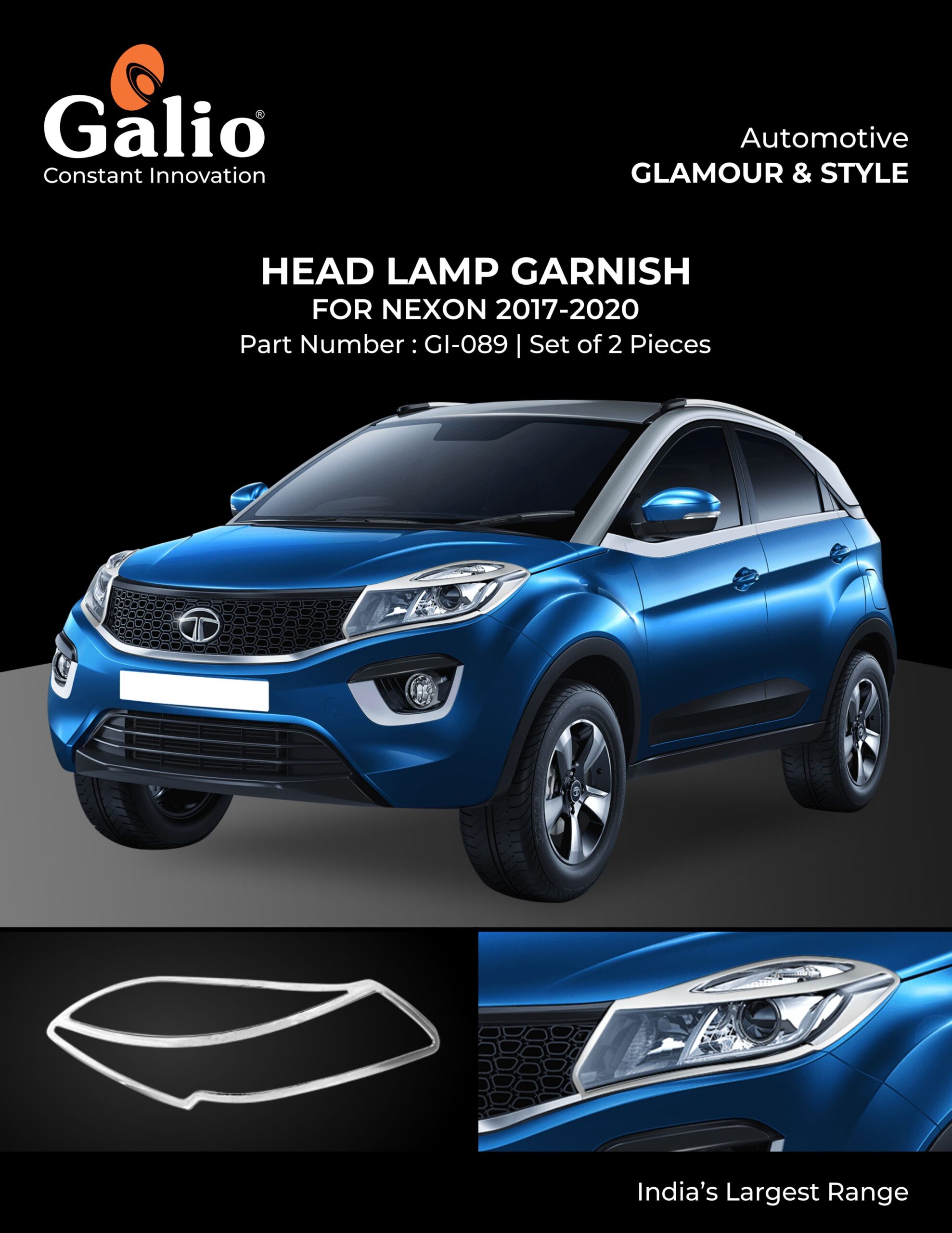 Upgrade the style of your Tata Nexon with this premium Head Lamp Chrome Garnish Set designed for 2017β2020 models. Crafted with high-quality ABS and finished in elegant chrome, these trims give your car a sharp and luxurious look. The design complements the headlamp shape and protects it from dust, scratches, and light impacts. Installation is quick and hassle-free with strong 3M adhesive backing.