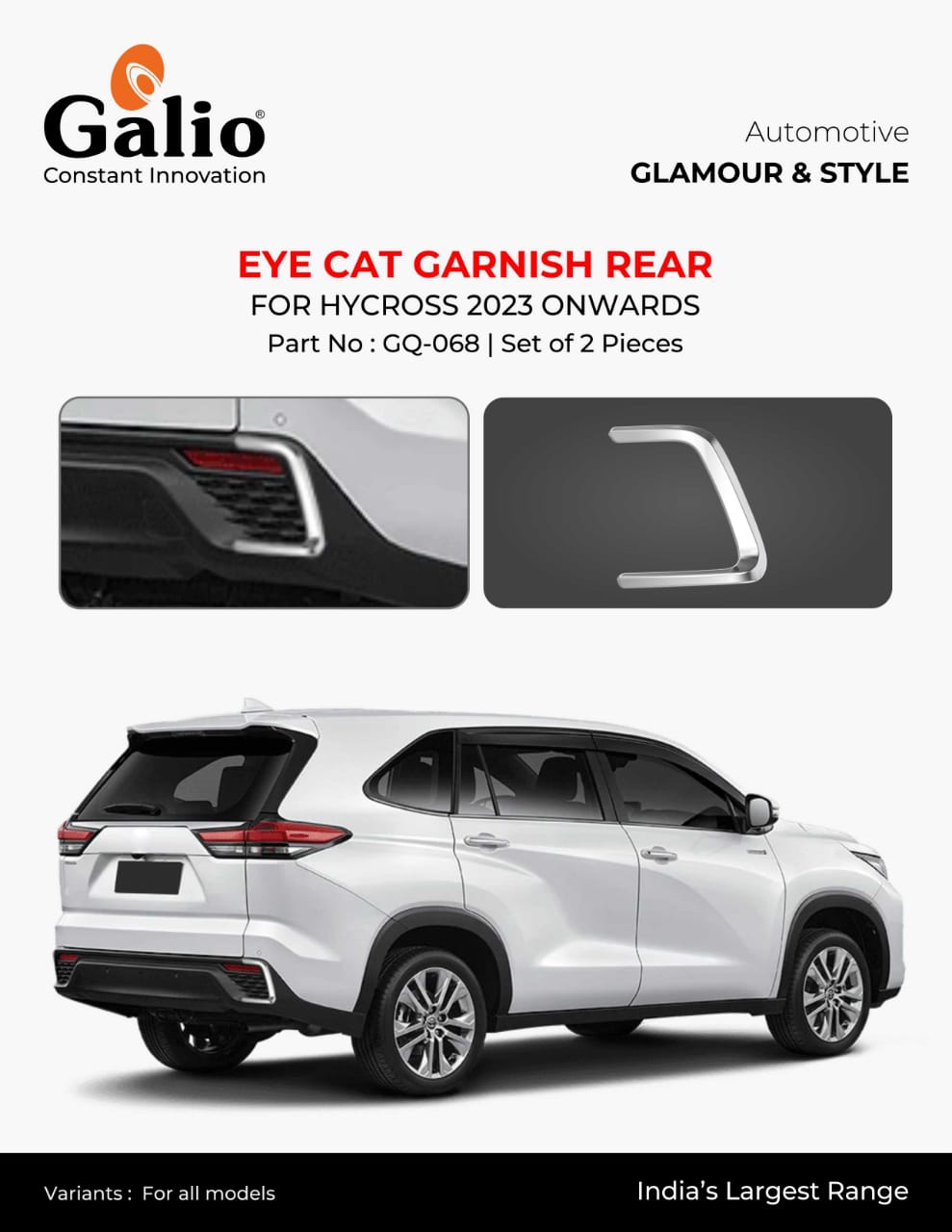 Upgrade the rear profile of your Toyota Hycross 2023 with this Eye Cat Garnish Chrome Set from Crazy Car Tech. Designed for all Hycross variants, these stylish rear trims enhance the tail light aesthetics with a sharp chrome accent that blends with your SUVβs premium character. Built with high-quality material and finished to last.